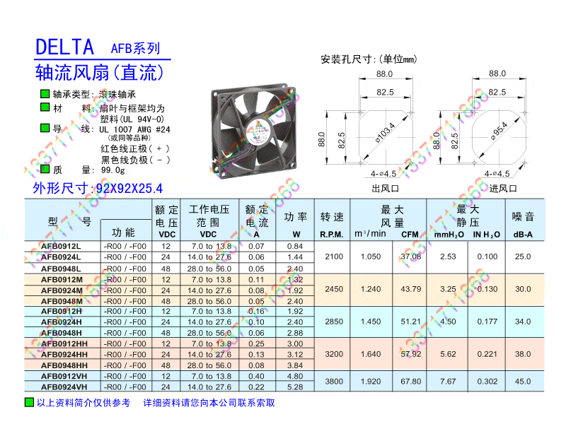 供應(yīng):DELTA臺(tái)達(dá)AFB09系列-直流DC軸流散熱風(fēng)扇,尺寸:92X92X25(mm)