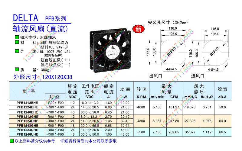 供應:DELTA臺達PFB12系列-直流DC48V軸流散熱風扇,尺寸:120X120X38(mm)