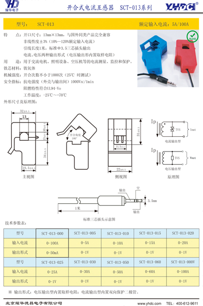 特點:開口尺寸:13*13,與國外同類產品兼容,非線性度3%(10%-120%額定輸入電流)引線長度一米,標準3.5三芯插頭輸出,電流電壓兩種輸出形式(電壓輸出形內置取樣電阻) 用途:用于交流電機、照明設備、空壓機等的電流測量、監控和保護 鐵芯材料:鐵氧體 機械強度:開合次數不小于1000次 安全指標:抗電強度(外殼與輸出間)1000V AC/1min 阻燃特性符合UL94-VO 工作溫度-25度-70度